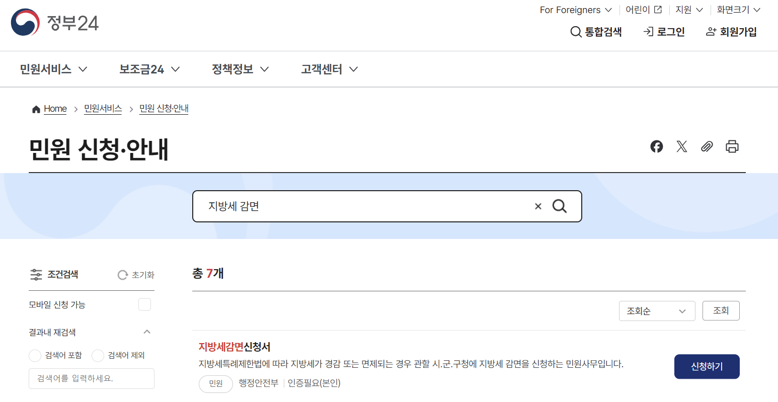- ‘재산세 감면 신청’ 검색 → 본인 인증 → 신청서 작성 및 첨부